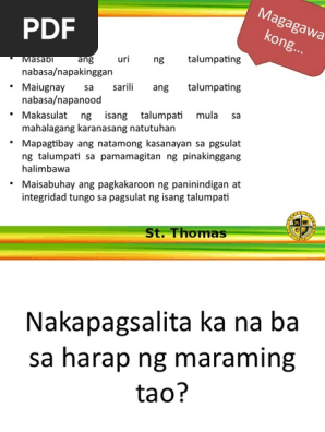 0 0 found this document. Inilalahad din dito ang iba pang impormasyon tungkol sa iyo na may kaugnayan. Mahalagang mapanatili ang pagtuon ng paningin eye contact sa mga tagapakinig upang madama ng mga ito ang sinseridad ng mananalumpati.