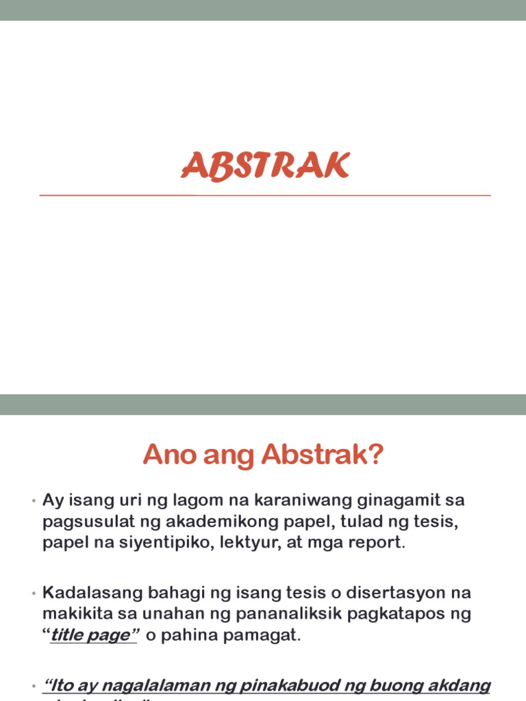 Ano Ang Kahulugan Ng Abstrak. Ito ay isang uri ng lagom na karaniwang ginagamit sa pagsulat ng mga akademikong papel tulad ng tesis papel na. Nakakapagpaunlad ito ng kakayahan at mga abilidad ng isang tao na naiaambag niya sa kaunlaran ng lipunan.