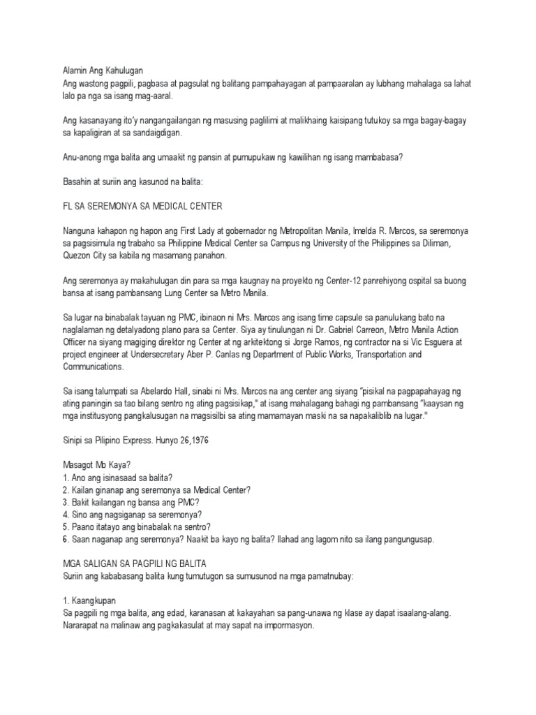Annika Zeline Peralta 5th Place in Copyreading Headline Writing 10. MISOSA Angkop na Pamagat ng Talata at Paggamit ng Malalaking Titik sa Pamagat Filipino 4 Ikatlong Markahan Modyul 8 Pagsulat ng Talata na may Sanhi at Bunga 4 Banghay-Aralin Titik Ii Panimulang Hakbang sa Pagbasa Pagsulat at Pagkwenta - Hiram na Titik - Facilitators Guide Contextualized Learning-Activity Sheets CLAS Filipino 5 Kwarter II - CLAS 4 Pagbibigay ng. Ito ang tinig ng pahayagannagbibigay ng kaalaman nagpapakahulugan humihikayat at kung minsay lumilibang sa mambabasa.
