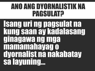 DYORNALISTIK NA PAGSULAT JOURNALISTIC WRITING-Ito ay may kinalaman sa mga sulating may kaugnayan sa pamamahayag. Dahil iyon ay nakaugalian na Ng mga pilipino at dahil narin sa pinaniniwalaan nilang mga kababalaghan o pamahiin. Ayon dito bubuo ng kahulugan ang mambabasa ayon sa taglay na kahulugan ng teksto.