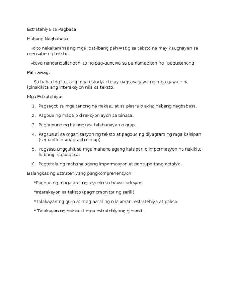 Start studying Mga Istratehiya at Aplikasyon sa Pagbasa. The first page is shown below. Ang pagbasa ay isa sa mga kasanayang pangwika na tulay ng mga mag-aaral upang mapahusay at malinang ang kasanayan sa mabisang pag-unawa sa teksto.