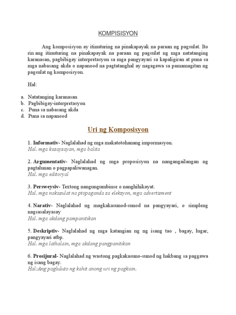 Sa pagsulat ng komposisyon. Ang termino na komposisyon ay may maraming kahulugan. Start studying Filipino - Pagsulat ng Komposisyon.